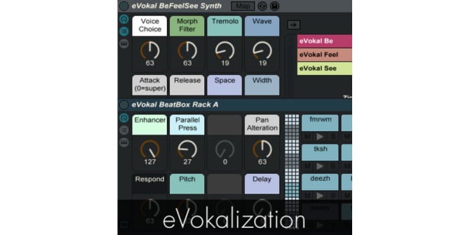 Free Live Pack from Animus Invidious a.k.a. PerforModule. "eVokalization" contains one melodic multi-synth Instrument Rack and one beatbox Drum Rack made out of the musician eVokal's processed voice. The pack also includes a selection of free-to-use beatbox loops created by eVokal off-the-cuff. The "eVokalization" Live Pack is self-installing and works for Live 9. More info.
