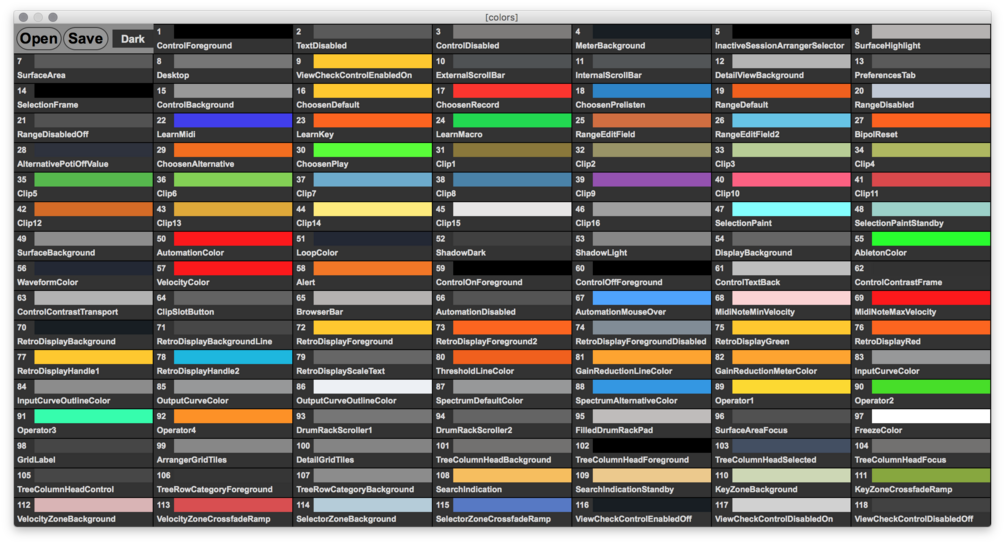 PDF guide in English and German containing detailed graphics showing which colour swatches are responsible for changing the colours of which elements in Ableton Live. Further instructions on using the Max for Live Skin Editor to create your own skins for Live can be found here.